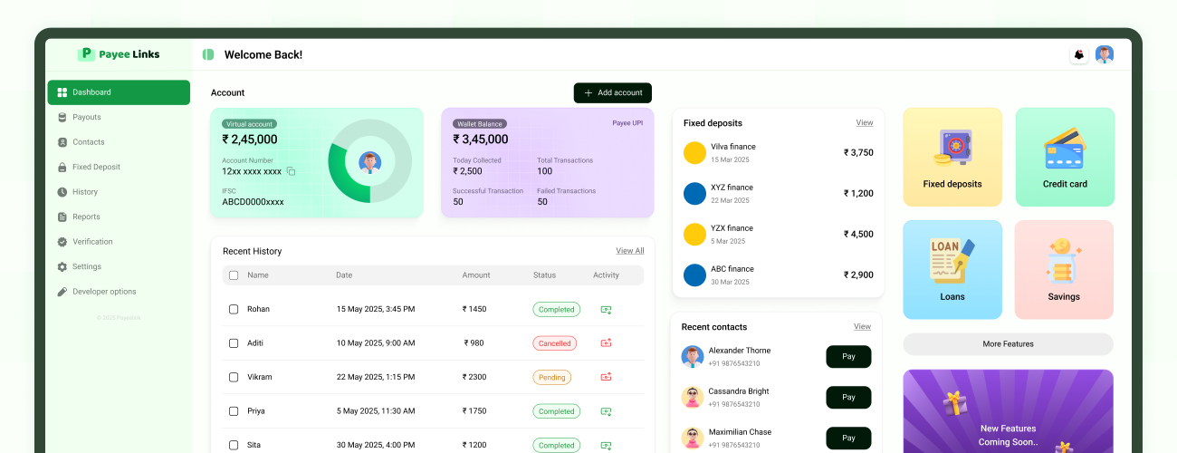 Open a digital account, make instant bulk payouts, and collect payments via UPI, QR, or virtual accounts. Our RBI-compliant platform offers top security, easy invoice management, and powerful APIs for KYC and GST verification. Payeelink helps e-commerce sellers, distributors, and marketplace owners save time and grow smarter.